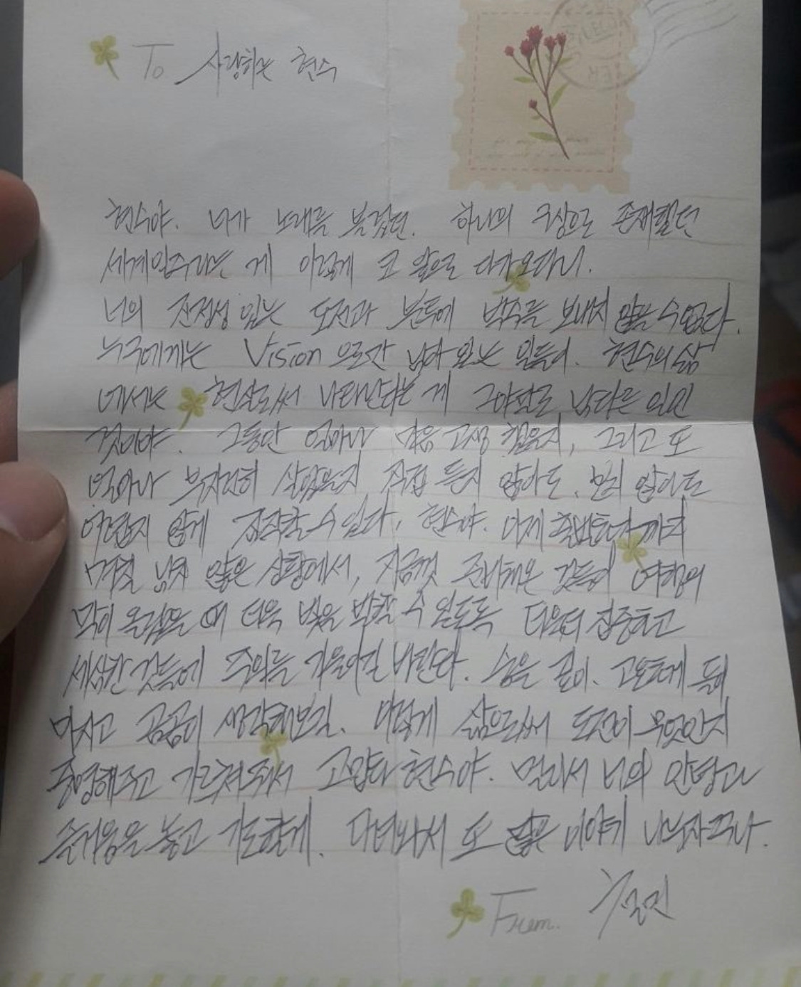 "현수야, 너는 남들 가지 않는 멋진 길을 선택했어 정말 멋있다. 건강히 잘 다녀와"