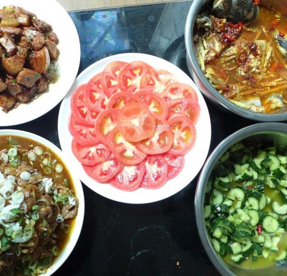 토마토 절임, 제육볶음, 메기찜, 오이절임