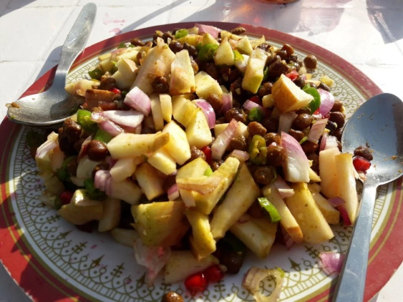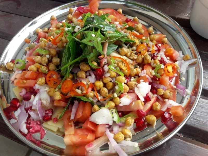 가스가 없는 옥상에서 내가 만들 수 있는 건 불을 사용하지 않는 음식 '샐러드'였다. 모방은 창조의 어머니라는 말이 있지 않은가. 전에 있던 게스트하우스의 파키스탄 아저씨가 알려준 레시피를 내 식대로 살짝 바꿨다. 사과와 석류, 마살라 파우더, 병아리콩, 청양고추를 한데 버무려준 뒤, 발사믹과 올리브유를 섞은 소스를 부어주면 끝이다.