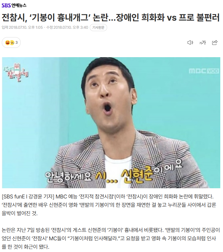 예능 프로그램 <전지적 참견시점>은 장애인 비하 논란으로 비판을 받았다. 배우 신현준 씨가 본인의 캐릭터인 장애인 기봉이 연기를 보여주며 웃음을 유도했기 때문이다. 장애인을 희화화한다는 의견에 맞서 프로불편러라는 반박이 댓글 사이에서 오갔다.