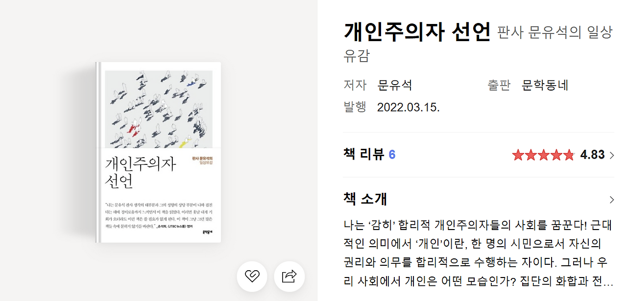 문유석 씨는 개인주의, 합리주의, 사회적 연대의식이 조화를 이루는 합리적 개인주의자들의 사회를 꿈꾼다. 개인이 집단적 논리에 빠져들지 않고 스스로가 바로 선다. 그 서는 과정에서 타인에게 피해를 주지 않고 존중하며, 자신의 책임을 진다. 사회의 문제를 해결하기 위해서 개인들이 연대한다. 저자의 생각과 행동처럼 실천한다면, 개인주의가 이기주의라는 굴레에서 벗어나지 않을까. 대한민국이, "나는 개인주의자예요"라고 당당히 말할 수 있는 사회가 되길.