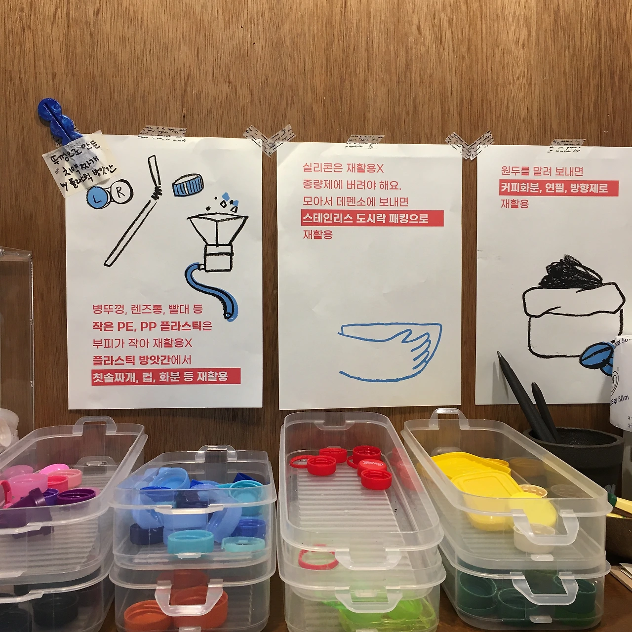 일단 가장 중요한 것은 씻어서 가지고 오는 것. 특히 우유갑은 씻어서 가위로 잘라 펼쳐야 한다. 많이 들어오는 일반쓰레기는 빨대. 역시 안 쓰는 게 최고다. 그리고 실리콘이나 종이가 붙은 페트병 뚜껑. 손끝으로 안쪽을 만져보면 느껴진다. 잡아 뜯으려고 해도 쉽지 않게 붙어있어서 재활용이 불가하다. 그리고 마지막엔 이제 양파망과 크레용도 받는다는 말도 덧붙여주셨다. 알맹이만 판매하는 것만으로 충분히 제 역할을 하지만, 시간을 내어 작은 플라스틱을 모아 주시는 것은 올바른 분리수거 방법을 한 명에게라도 더 알려주기 위함이 아닐까. 귀찮은 질문쟁이인 나도 많이 배워왔다. (내가 그동안 거절당한 ‘일반쓰레기’들은 배달음식 포장 칼, 마스크 클립, 오렌지주스 속뚜껑.)