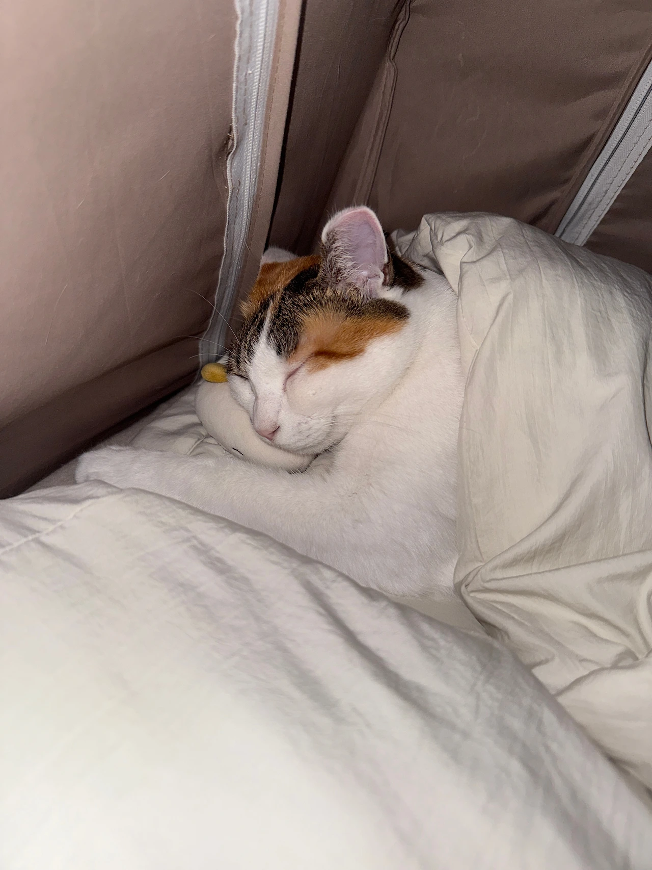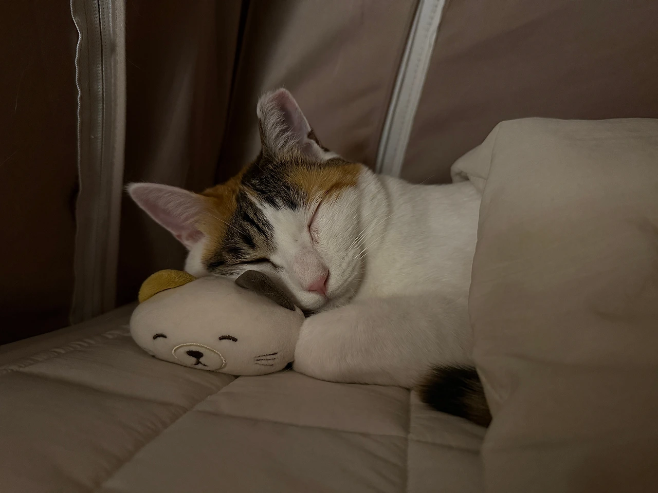 왼쪽으로 돌아누워 한쪽 팔로 콩이를 감싼 채 눈을 감는다. 우리의 취침 루틴이다. 자다 깨면 콩이를 더듬어보곤 내려가 있는 이불을 끌어당겨 다시 덮어준다. 시원하게 튿어진 난방 텐트 틈새로 새벽 공기가 들어오고 있다. 잠들기 직전에 종종 각성하는 콩이가 활개를 치고 날아다니며 만들어 놓은 작품이다. 작가는 태평하게 지를 꼭 닮은 인형을 베고 있다. 내 사랑은 카라멜 향이 나는 보들보들한 삼색. 그 사랑은 보이지 않아도 보이고 들리고 맡아진다.