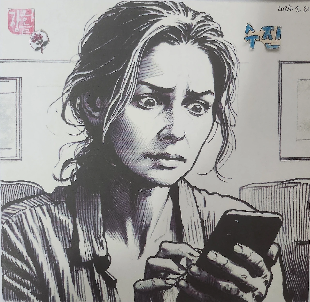 수진은 손끝으로 핸드폰을 단단히 쥐었다.