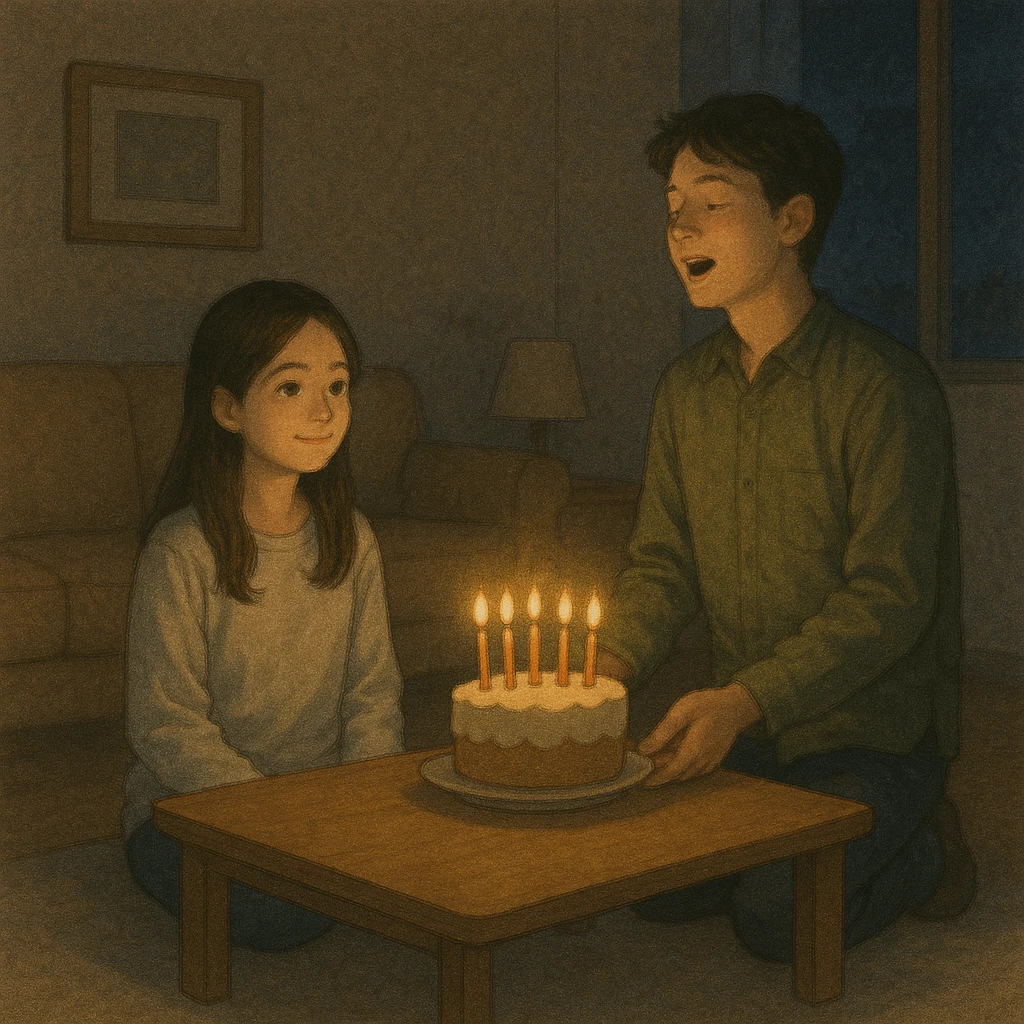 불을 끄지 않은 생일 케이크 앞에서