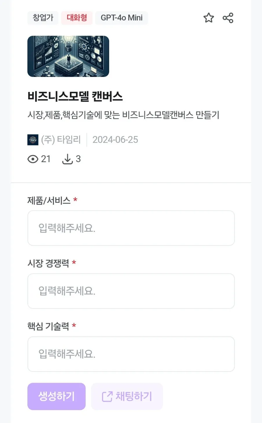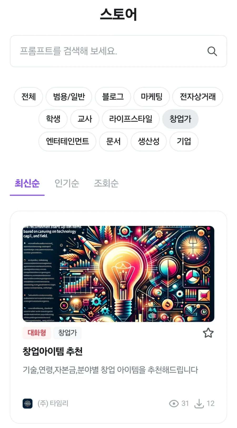 스토어 기능에서 창업가를 누르면 창업아이템 추천, 린캔버스로 아이템 검증, 투자유치 IR 발표, 비즈니스모델 캔버스 등의 양식이 있다.