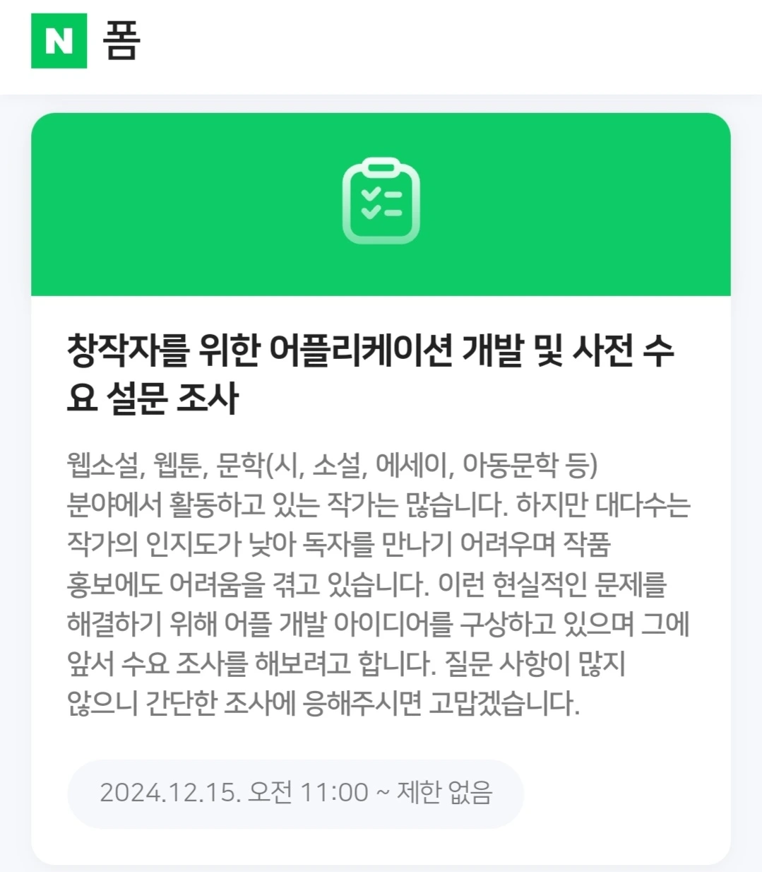 웹소설, 웹툰, 문학(시, 소설, 에세이, 아동문학 등) 분야에서 활동하고 있는 작가는 많습니다. 하지만 대다수는 작가의 인지도가 낮아 독자를 만나기 어려우며 작품 홍보에도 어려움을 겪고 있습니다. 이런 현실적인 문제를 해결하기 위해 어플 개발 아이디어를 구상하고 있으며 그에 앞서 수요 조사를 해보려고 합니다. 질문 사항이 많지 않으니 간단한 조사에 응해주시면 고맙겠습니다.