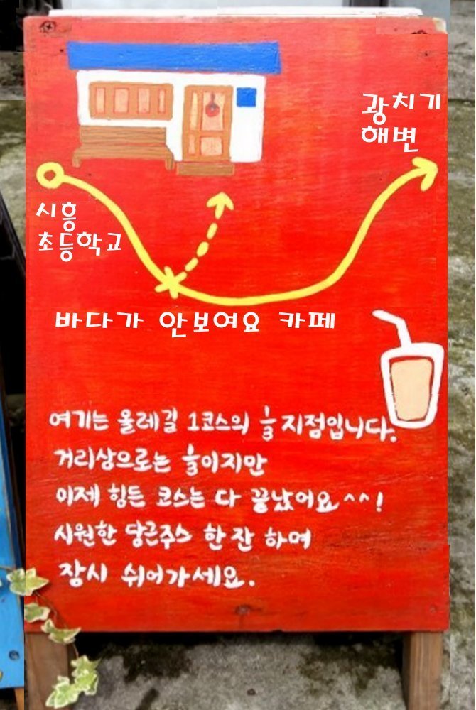 땅 끝 마을이라는 종달리(終達里) 표지석을 지나 [종달1교차로]에 있는 식당 “종달수다뜰”에 머물며 먼저 오징어 파전에 유산균 제주막걸리로 목을 축인 뒤 고등어조림과 갈치조림으로 점심을 마치고 달큼한 제주당근 주스로 마무리를 한다. 다시 길을 재촉하는데 예쁜 카페 입간판이 눈에 들어와 올레길의 피로를 풀어준다.