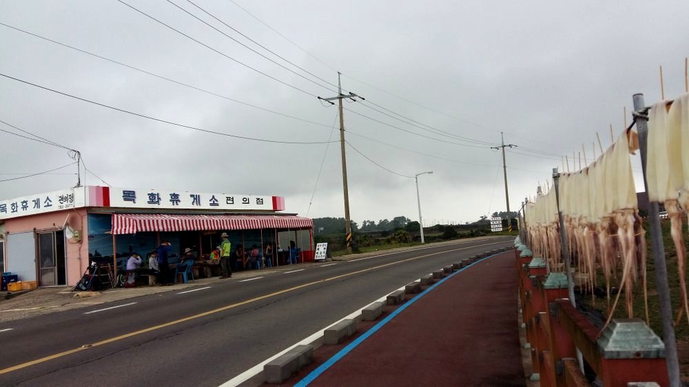 이어 해변도로의 해녀 조각상과 종달리 [해녀의 집] 앞을 지난다. 해안도 길가에는 껍질 벗긴 반 건조 오징어를 말리고 있는데 이곳에서는 준치라고 불리고 있다. 잠시 [목화휴게소] 편의점에 머물며 시원한 제주막걸리와 함께 제주산 준치를 맛본다.