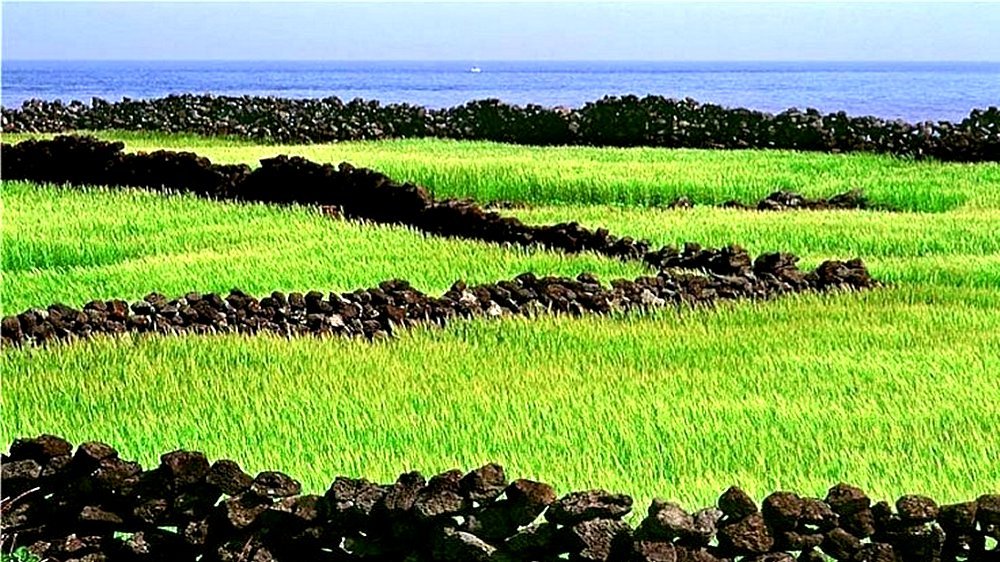 마을길로 들어서니 이내 해안길이 나오는데, 제주에서만 볼 수 있는 검은 돌담을 두른 밭들이 옹기종기 붙어있는 들녘모습이 연초록 천을 곱게 기워 붙인 한 장의 조각보처럼 아름답다.
