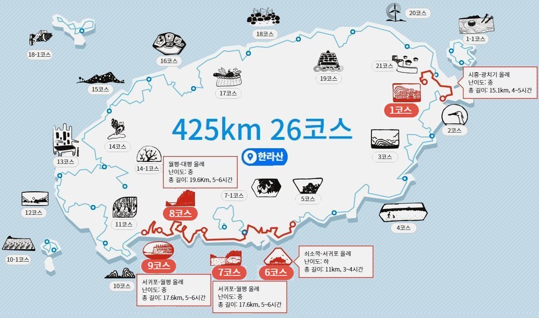 지금까지 (사)제주올레가 연결해놓은 올레코스는 알파코스 5개를 포함해 총 26개 코스에 이른다. 2007년 9월 제1코스인 시흥초교에서 광치기해변 구간이 개발된 이후 2016년 5월까지 총 425km를 개발함으로써 제주외곽 전역을 올레길로 연결해 놓았다.
