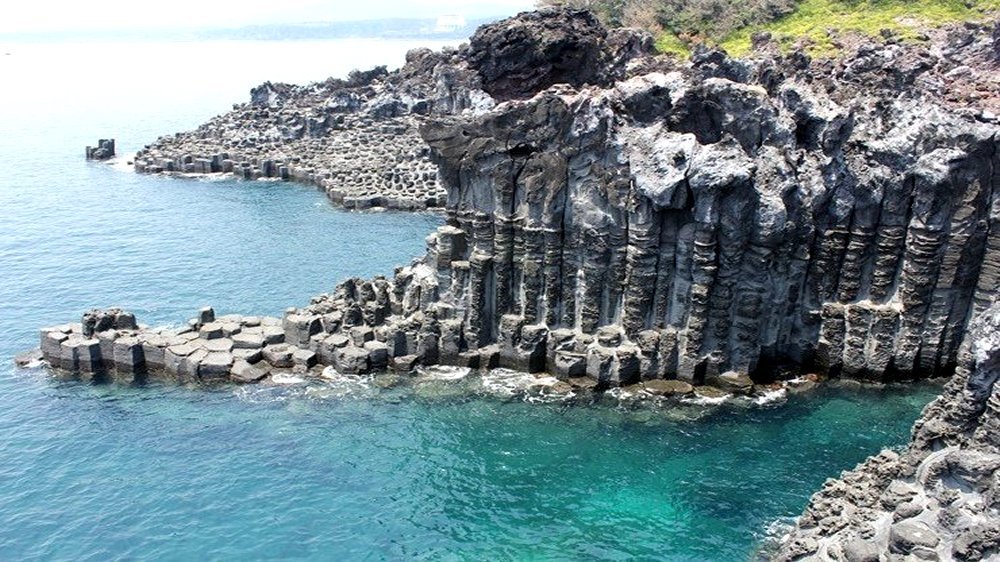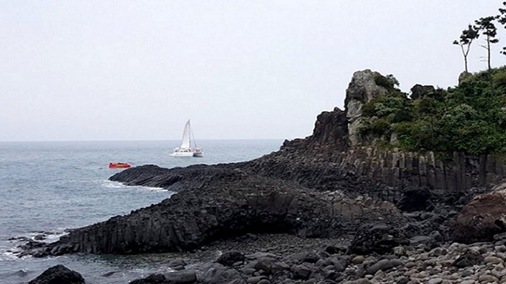 오후 2시 [지삿개] 인근 “대기정식당”에서 간단히 점심을 마치고 다시 길을 재촉한다. 길이 끝날 즈음 각진 기둥이 겹겹이 쌓인 웅장한 [지삿개 주상절리대]가 나타나는데 검은 기둥에 부딪혀 퍼지는 하얀 파도가 멋진 색의 향연을 베푸는 듯 보인다. [주상절리]는 화구에서 바다로 밀려내려온 용암이 바닷물에 닿아 굳어지며 형성된 사각과 육각의 긴 기둥모양이다.