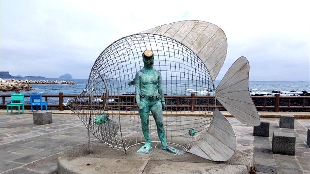 [수봉로]를 따라 나지막한 경사를 오르니 "범섬"이 이전보다 많이 가까워진 듯 보인다. 이어지는 길은 [법환포구]로 검은 현무암들이 즐비한 바닷길을 끼고 제주해녀 체험센터가 나타나는데 이곳은 물질을 배우기 위한 초보 해녀들의 실습장인 듯 보인다.