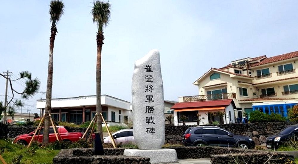 당시 마지막 잔당들이 [범섬]에 웅거해 항거하며 최후까지 버티다가 범섬 낭떠러지에 떨어져 죽고 10여일 만에 항복한 역사적인 격전장으로 이를 기념하기 위해 [최영장군 승전비]를 세우게 되었다 한다.