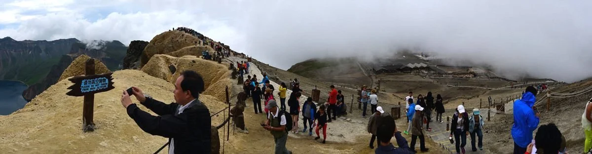 14시경 도착한 백두산정상 주차장은 구름 떼가 몰려들어 산 아래 조망이 확보되지 않는 채 구름이 자욱했지만, 천문봉 정상에는 하늘이 보이는 듯 했다.