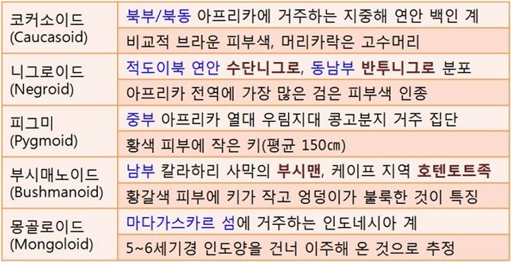 아프리카 인종(人種)은 중부아프리카인 사하라사막 이남지역에서 약 10만 년 전, 북아프리카에서는 그보다 조금 늦게 출현한 것으로 보인다. 오늘날 아프리카 북부는 유럽계 민족이 대다수를 차지하고 있으며, 토종 아프리카 민족으로 구성되어 있던 중남부는 15세기 노예무역과 함께 아메리카 신대륙으로 널리 퍼져나갔다.