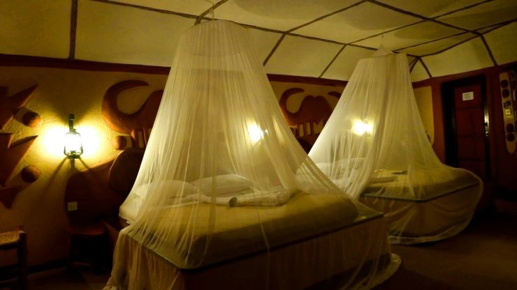 [Sopa Lodge]에는 각방에 미니금고가 비치돼 있고 저녁에는 모기약을 뿌린 뒤 모기장을 쳐준다. 숙소 벽에는 등잔불 같은 조명시설과 아프리카 전통느낌에 문향이 그려진 목각이 있어 마치 아프리카 부족장의 방인 듯 느껴진다. 서둘러 다음날 이동할 짐을 챙긴 뒤 테라스의 희미한 가로등 불빛아래 앉아 아프리카의 푸근했던 첫날 풍경을 가슴에 담아 넣는다.