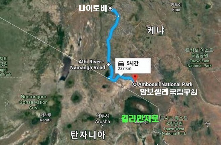 나이로비 남동쪽으로 탄자니아 국경을 따라 250km 떨어진 [암보셀리 국립공원]은 편도 1차선으로 5시간을 이동한다. [암보셀리]는 마사이족의 생활터전이자 아프리카 코끼리들을 가까이에서 볼 수 있는 곳이다. 또한 케냐와 탄자니아 국경에 자리한 [킬리만자로]가 전망이 좋은 곳에 위치해 헤밍웨이가 [킬리만자로의 눈]을 집필했던 곳이기도 하다.