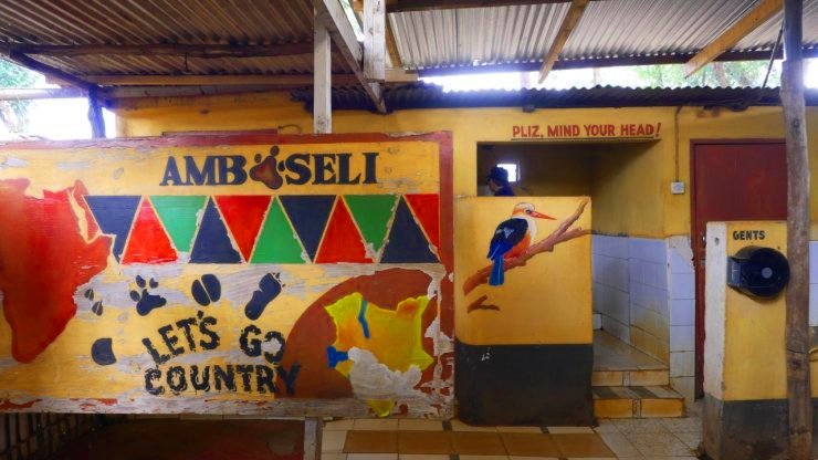 잠시 머무는 휴게소는 허름한 아프리카 기념품 가게인데, 안으로 들어가 화장실을 찾으니 변기통이 없는 옛날식 화장실 모습이다. 양철지붕을 얹은 화장실 입구에는 케냐국기를 상징하는 검정, 빨강, 초록 3색 문양과 머리를 찧지 않도록 조심하라는 문구가 눈길을 끌고 있다.
