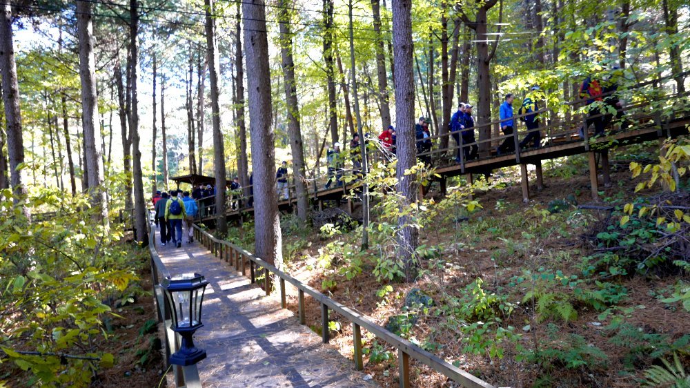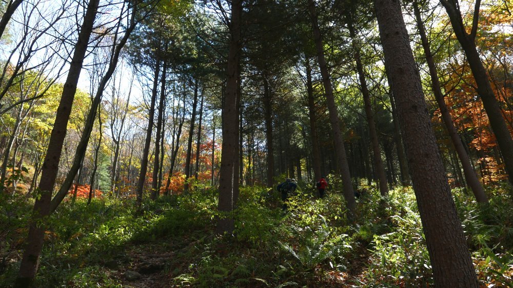 얼마간 이어지는 가파른 길을 오르다보면 등줄기에 땀이 차고 호흡도 가빠지는데, 통나무 계단 길을 오르며 능선중턱에 이르러 잠시 휴식을 취한다. 행렬일부 선두는 정상을 오르고 일행 대다수는 중도에서 하산을 택해 가을풍경을 눈에 담아 넣기에 바쁘다.
