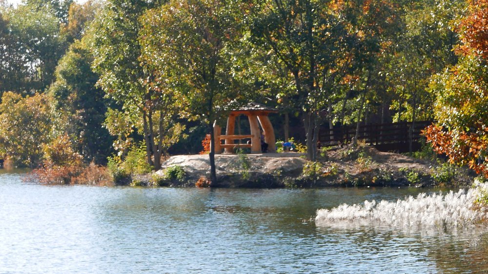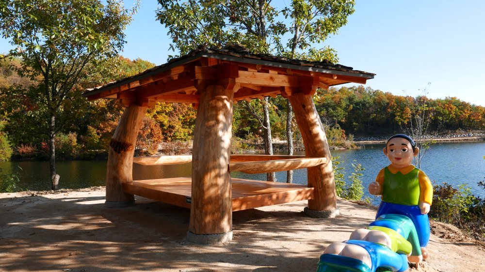 다시 길을 재촉하다보면 양지바른 호수길목에 버섯을 상징케 하는 정자가 나타나는데 이곳에는 개구쟁이 어린 시절 말뚝박기 놀이하던 조형물이 세워져있어 잠시 옛 시절을 떠올리며 조형물 위에 올라타 보기도 한다.