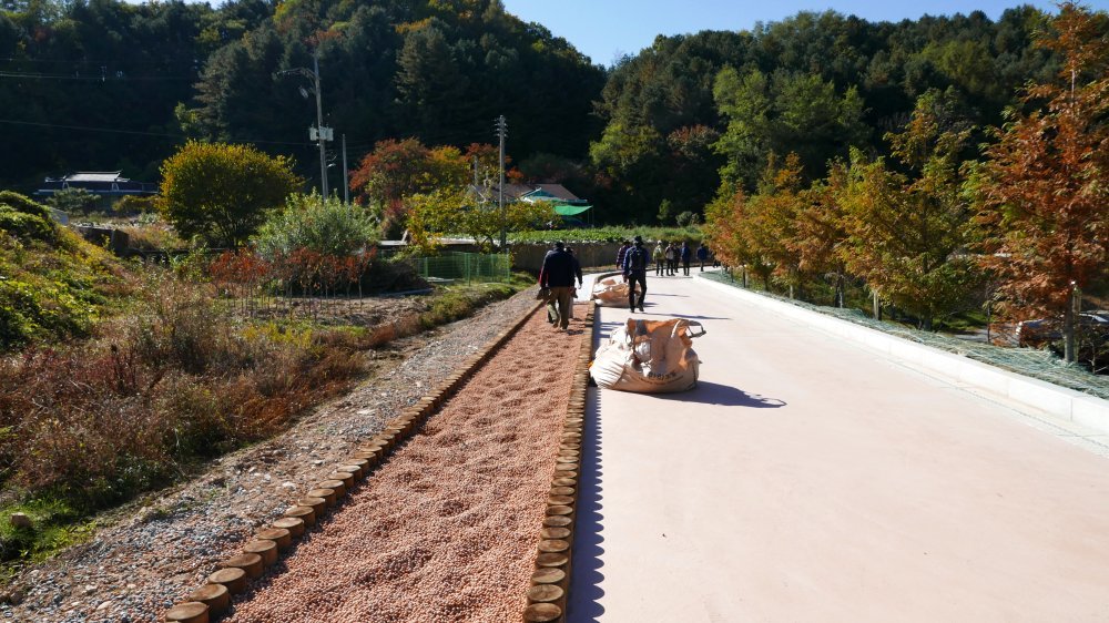 5코스 초입 ①[코뚜레 게이트]를 통과하면 작은 마을이 나타나는데 동네어귀에 황토자갈과 조약돌 위를 맨발로 걸어볼 수 있는 ②[건강길]을 조성해 놓아 색다른 체험을 맛보게 한다.