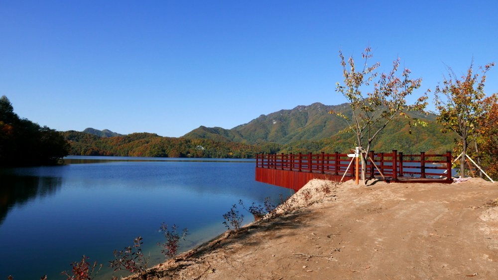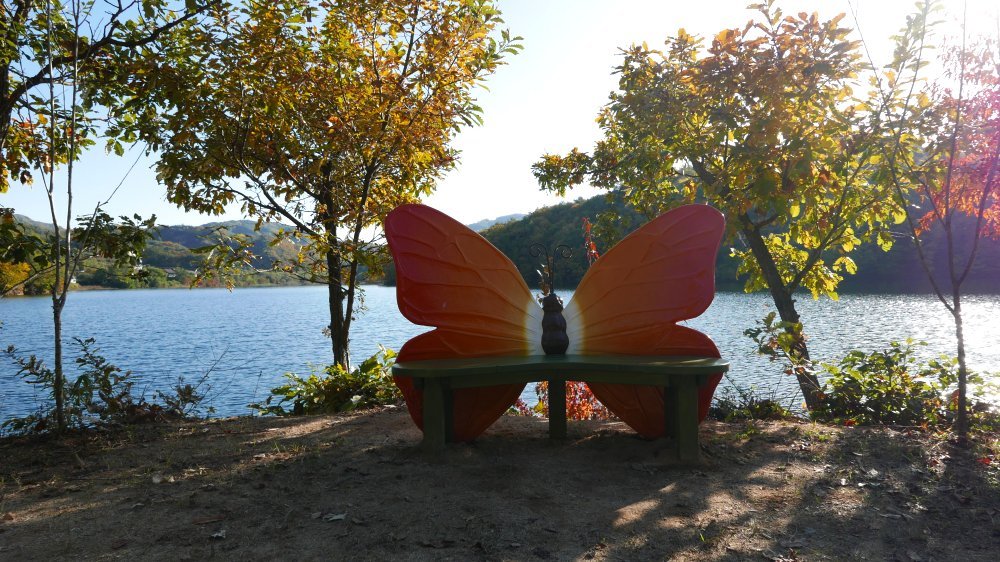 호수를 끼고 이어지는 5코스 끝자락 길에는 갑천면의 상징인 나비를 형상화해 설치한 멋진 벤치가 한눈에 들어온다. [횡성호수길]은 여기저기 전망대가 있어 10월의 멋진 가을풍경을 스케치하기에 부족함이 없어 보인다.