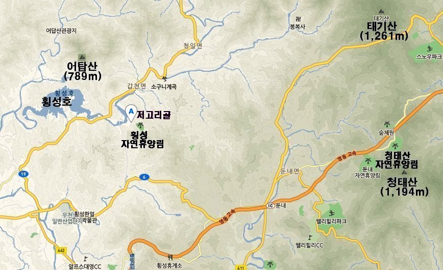 횡성에는 [청태산 자연휴양림] 이외 [횡성호수]를 끼고 있는 산기슭아래 [횡성 자연휴양림]이 있다. 횡성 자연휴양림에는「저고리 골」이라는 지명이 있는데 지금은 횡성댐 건설로 인해 가옥 한 채 없는 골짜기로, 아득한 옛날에 호랑이가 사람을 잡아먹고 저고리만 남겨놓았다고 하여 붙여진 이름이라 한다.