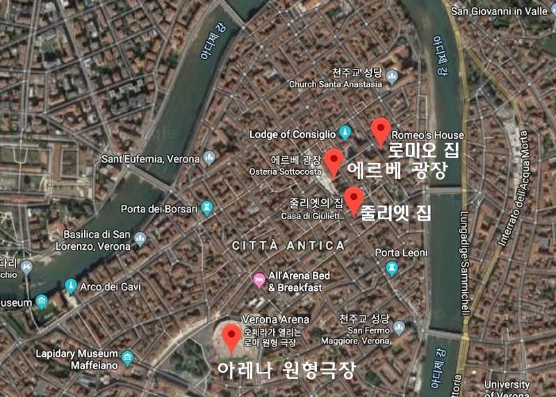 [베로나]에서 고대 로마의 대표적인 유적은 원형극장 아레나(Arena)이다. 현재 아레나는 야외 오페라 공연장으로 사용되고 있고, 아디제 강 건너 언덕기슭에 있는 반원형 극장에서는 여름철이 되면 셰익스피어 희곡 “로미오(Romeo)와 줄리엣(Giulietta)”이 공연되고 있다.