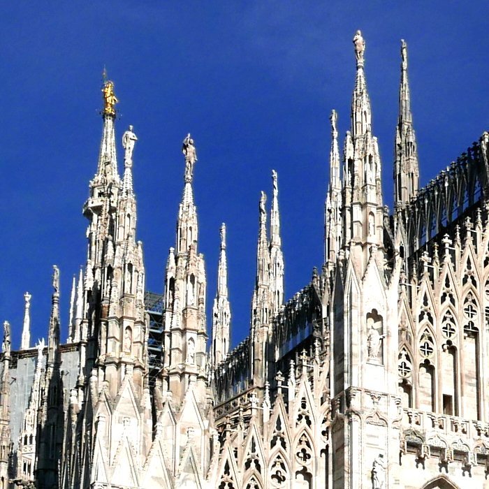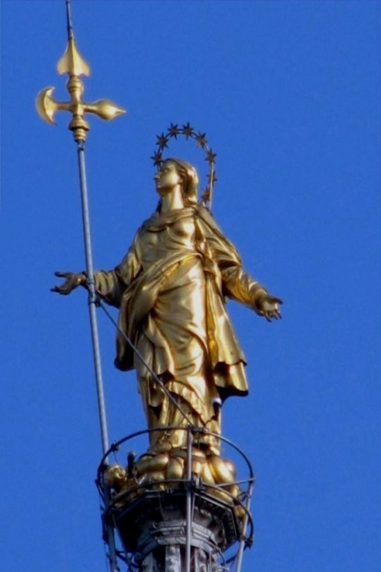 첨탑지붕(좌측) 마돈니나 조각상뛰어난 고딕양식으로 건축된 밀라노 대성당은 2,000여개의 성인상과 135개 소첨탑이 외관을 장식하고 있다. 특히 대성당의 108m 첨탑지붕 위에 “작은 성모'라는 뜻의 마돈니나(Madonnina) 조각상이 3,900장의 금박으로 장식돼 있어 눈길을 끈다.