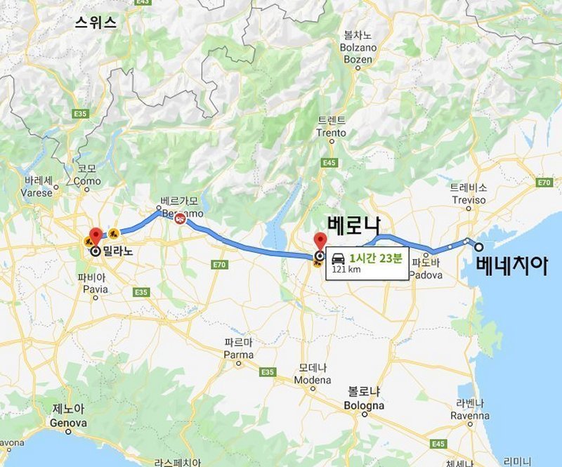 [베니치아]에서 점심을 중식(中食)으로 대충 때우고 쉴 새 없이 [베로나]로 이동하기 위해 1시간 30분가량을 달려간다. 베로나는 아디제(Adige) 강이 시내중심 북서쪽을 휘감고 유유히 흐르고 있다.