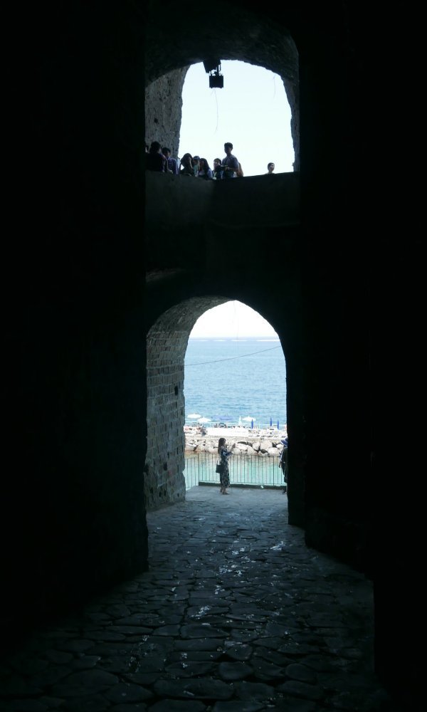 [유적지]가 시작되는 곳에는 포르타 마리나(Porta Marina)라는 두 개의 문이 있다. 당시 출입문 앞으로 이어지는 길은 바다를 향해 있었기 때문에 Marina(정박지)라고 불렀다. 두 개의 출입구 중 높은 아치형 통로가 마차와 가축의 출입로였고, 낮은 아치 지붕은 사람이 출입하는 통로였다고 한다.