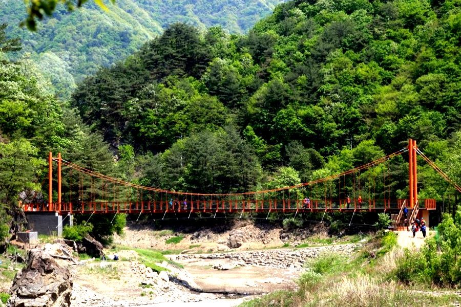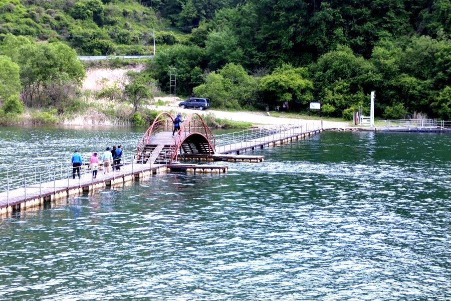 비수구미 마을로 들어가는 또 다른 방법은 [평화의 댐] 갈림길에서 비포장도로로 2km 들어가 선착장 앞에 차를 세워두고 산길을 따라 걷는 것이다. 20분쯤 걸으면 [붉은 출렁다리]가 나오고 다리를 건너면 비수구미 마을이다. 민박집에 미리 연락해 선착장에서 배를 타고 들어갈 수도 있다.