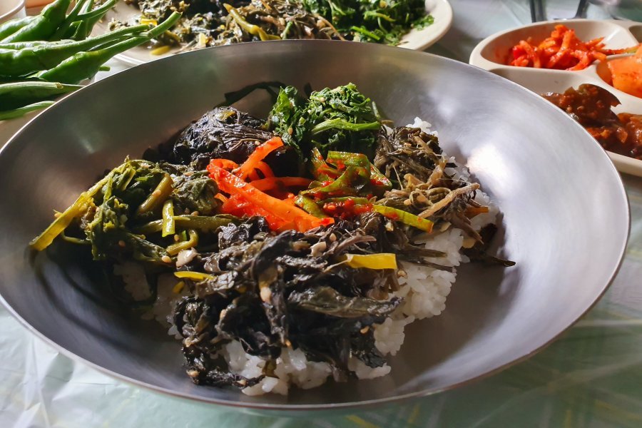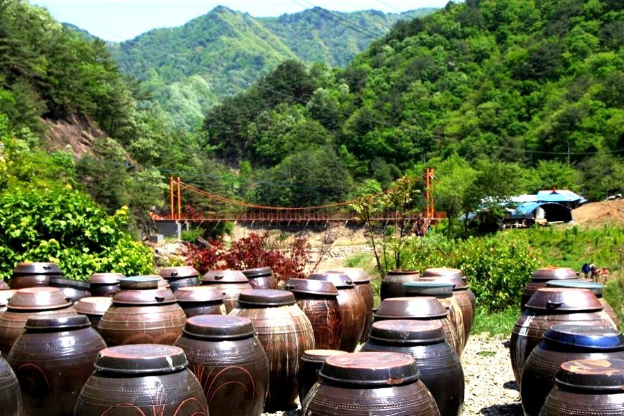 시골밥상 집 장독대직접 산에서 채취한 고비, 곤드레, 곰취, 쇠비름, 취나물 등 5가지 나물이 한 접시에 담겨 나오고, 고추장과 고들빼기, 매실장아찌, 김치 등 맛깔스런 10여 가지 반찬과 된장국이 푸짐하게 차려져 입맛을 돋운다. (시골밥상 집: 강원 화천군 화천읍 동촌 2리 비수구미 2715번지/ ☏: 033) 442-0145)