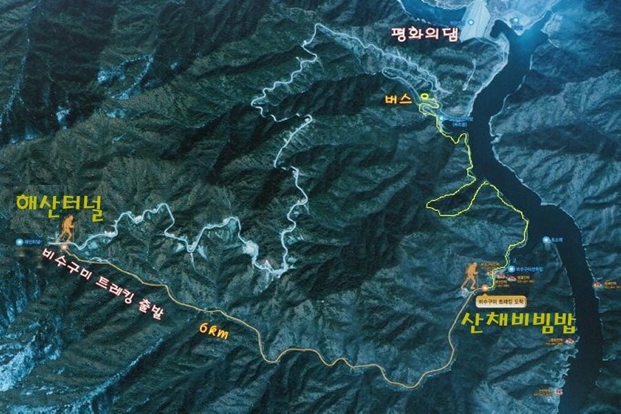 비수구미 트래킹 코스는 화천 해산령에서 비수구미 마을로 나와 다시 파로호를 따라 버스가 머물러 있는 도로까지이다. 이어 아흔아홉 구빗길을 따라 "평화의 댐"으로 향한다.