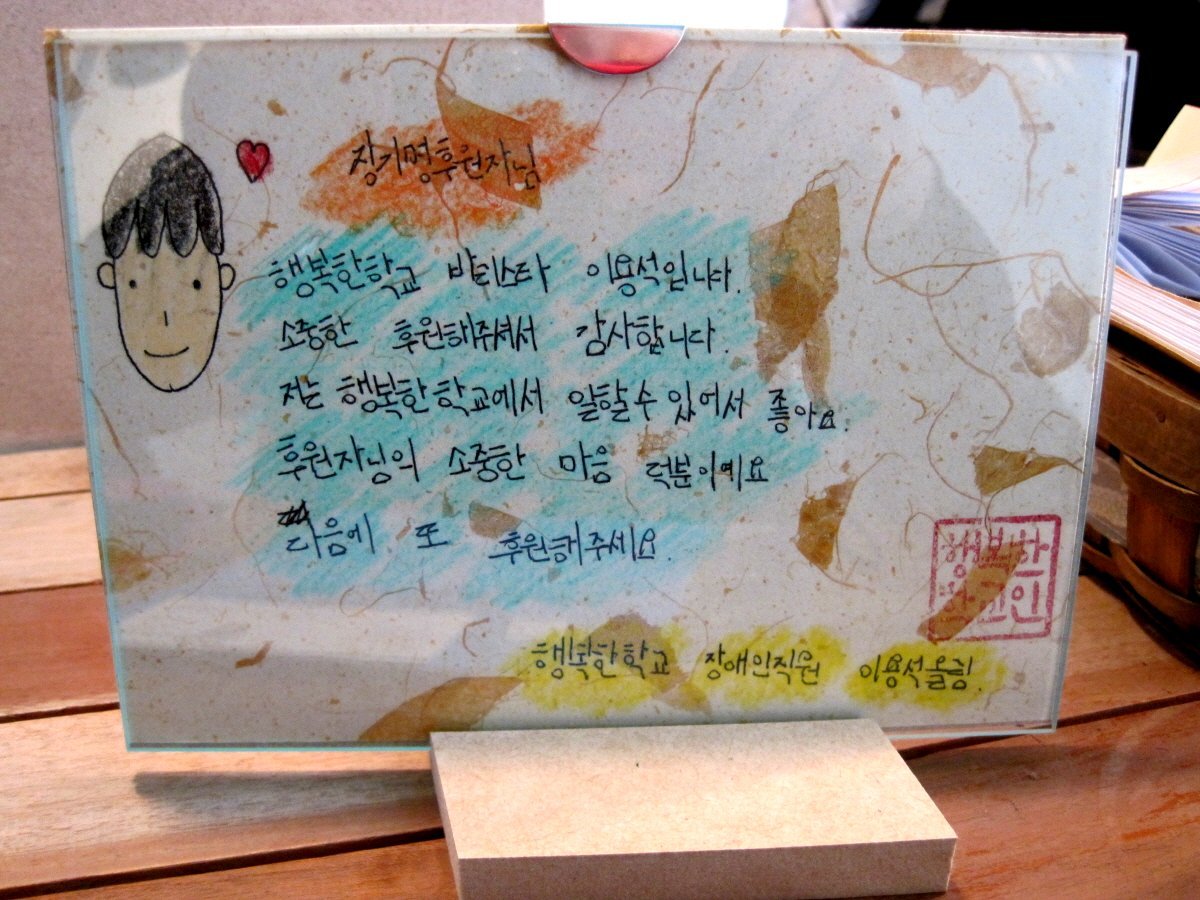 辛卯年 희망제작소의 행복설계 아카데미를 수료하며 두 달간 함께했던 교육생들의 소장품을 경매에 붙여 소액기금을 만들었는데 그동안 적정 기부처를 찾느라 수개월이 돼서야 이곳에 기부하게 되었다. "행복한 학교"는 지적장애인과 사회적 취약계층들이 일을 할 수 있도록 자활을 돕고 그들이 진정한 사회적 자립의 꿈을 키워갈 수 있도록 돕기 위해 설립된 사회적기업이다.