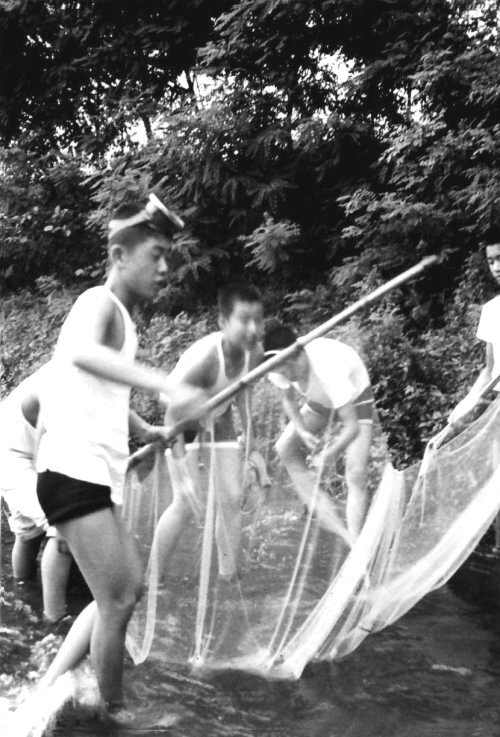 따가운 여름햇살이 머무는 시각, 과수원주변 풀밭 길을 휘도는 야트막한 시냇물과 파란하늘에 이파리가 젖어있는 아름드리 플라타너스가 그늘진 곳에 머물며 얄개들은 대형그물을 펼쳐들고 여울목을 몰아가며 개울가 가득한 민물고기를 퍼 올렸다.