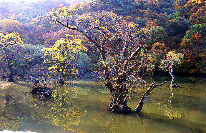 주산지 가을명승(名勝) 제 105호로 지정된 주산지는 주산천 지류의 발원지로 비가 오면 바닥이 스펀지처럼 물을 머금고 있는 퇴적암층을 형성하고 있어 그 오랜 세월 가뭄에도 바닥이 드러난 적이 없다고 한다. 늦가을 주산지 연못에서 자생하는 왕버들 수목(水木)들의 고고한 자태는 마냥 신비롭기만 하다.