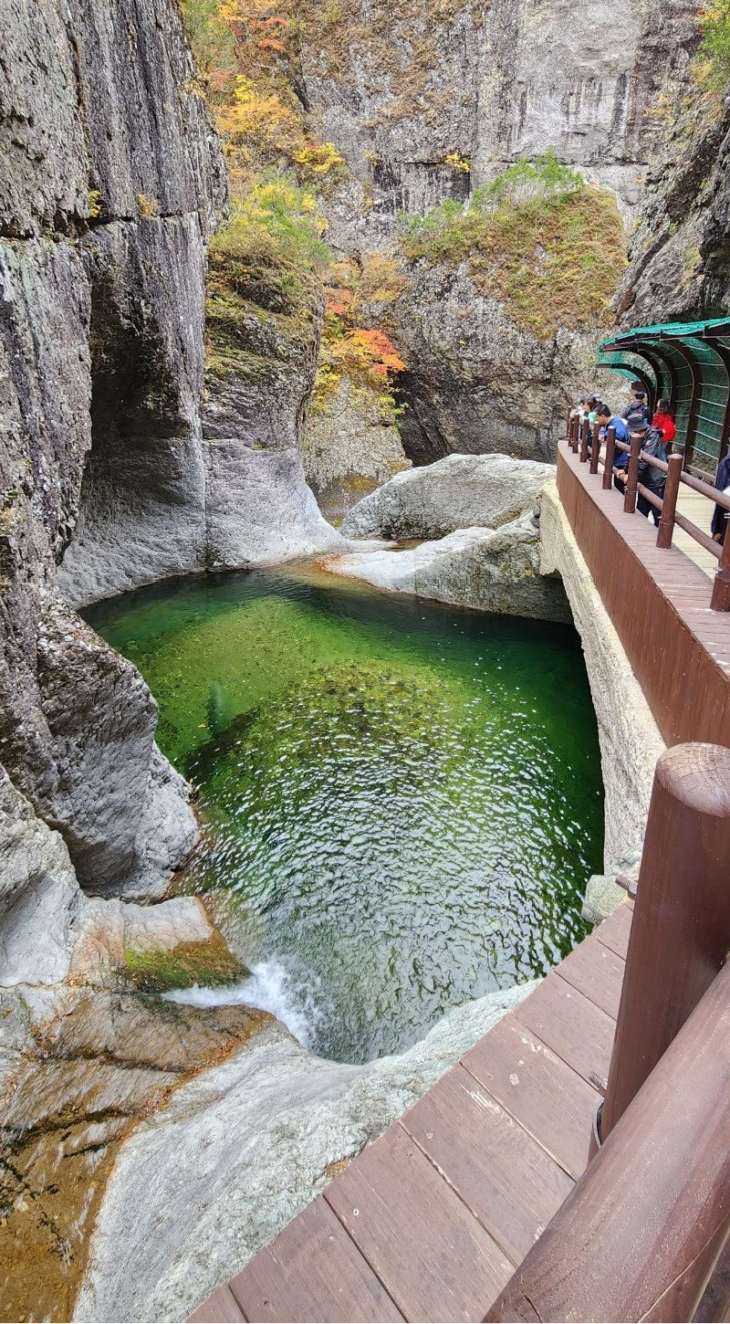 용연폭포 하단용연폭포 아래에는 널따란 포호(布湖)가 형성되어 있고 폭포를 편안히 감상할 수 있도록 데크를 잘 설치해 놓았다. 트래킹 내내 맑고 깨끗한 물이 흐르고 나지막한 폭포와 보기드믄 기암괴석이 병풍처럼 늘어서 있는 가을 절경(絶景)을 눈에 담으며 발길을 돌린다.