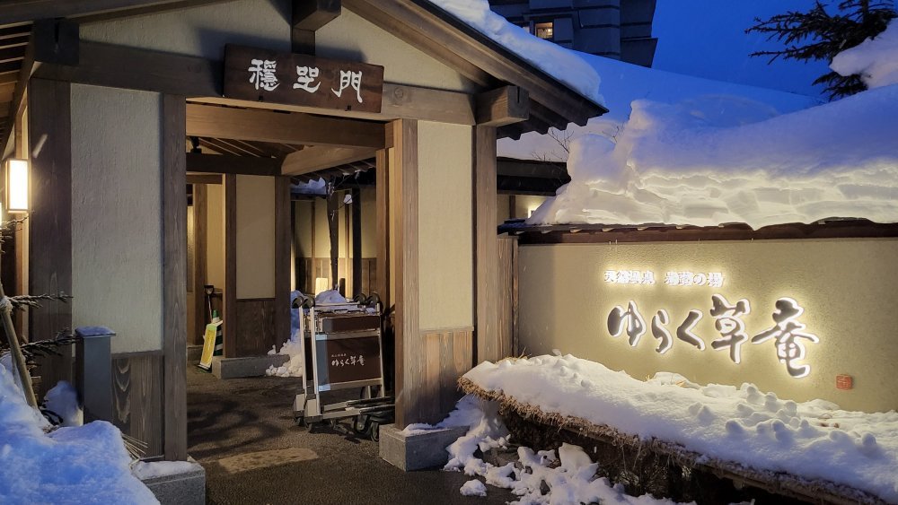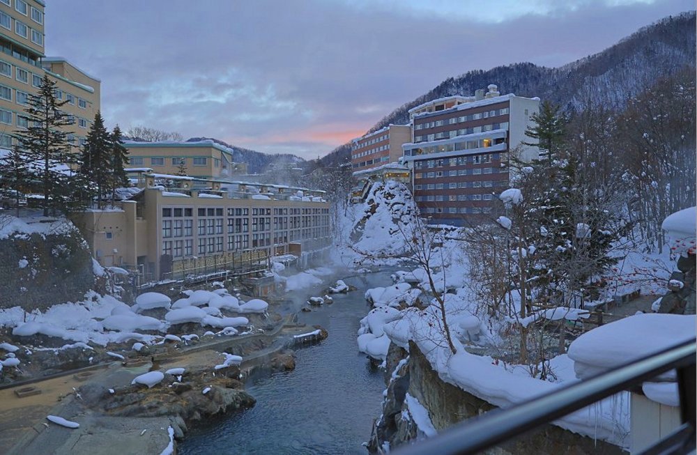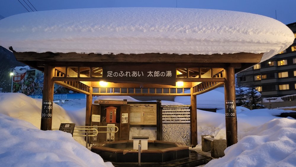 온천호텔에는 커다란 고드름이 강가 쪽을 향해 자라고 있는데 이런 것도 북해도의 겨울낭만을 느끼게 하는 풍경이었다. 룸 배정을 받고 어둑해진 밖으로 나와 눈 덮인 조그마한 온천마을을 둘러보는데, 동전을 넣고 족욕(足浴)하는 곳이 있고 와라쿠(和樂)草竜 간판의 욕탕업소도 눈에 띈다.