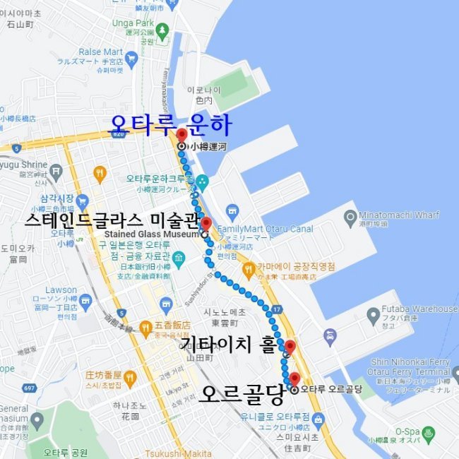 오타루(小樽) 거리에는 투명한 운하 위로 하얀 구름이 비치는 오타루 랜드마크 ①오타루 운하가 있고 ②스테인드글라스 미술관을 비롯해 약 1만 여점의 오르골(Orgel)이 화려하게 장식되어 있는 ③오르골당이 있다. 그밖에 일본전통 유리공예 공방거리의 ④기타이치(北一) 홀이 볼거리이다.