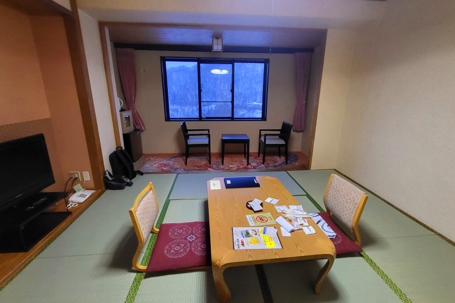 뷔페 초밥코너죠잔케이 숙소는 본관 지하1층에 노천탕과 신관 16층에 전망 대욕장이 있고 객실은 다다미방으로 저녁식사를 하는 동안 종업원이 잠자리 이불을 깔아준다. 다다미방은 생각보다 따듯해 편한 잠을 잘 수 있었다.
