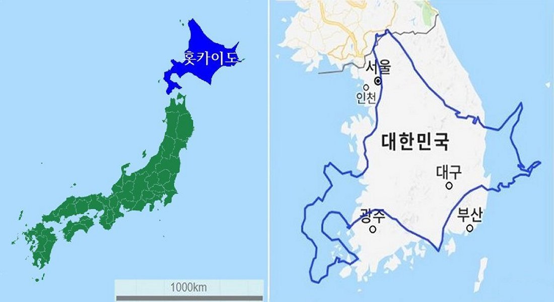 쿠릴열도를 포함한 북해도 면적은 83,424k㎡로 대한민국 영토(100,412km²)의 5/6 크기이며, 일본열도 총면적의 약 22%를 차지한다. 하지만 홋카이도 인구는 일본전체 4%정도인 520여만 명에 불과해 인구밀도는 낮은 편이다.