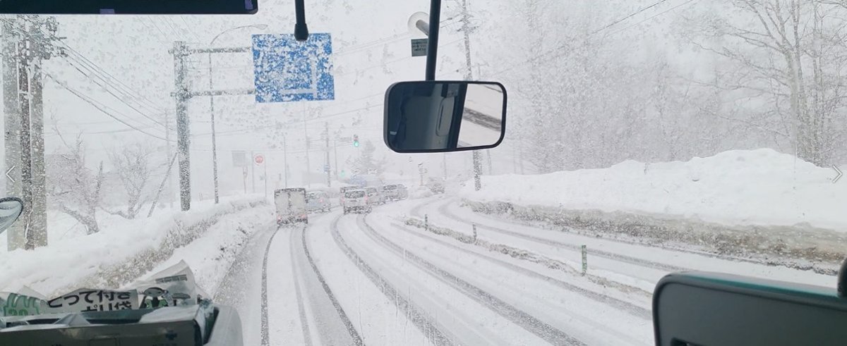 버스에 올라 죠잔케이(定山溪)로 이동(1시간 20분)하는 동안 눈이 펑펑 쏟아진다. 차창밖에 퍼붓는 눈에 취해 있다가 날리는 함박눈을 찍기 위해 앞자리로 이동해 동영상을 찍는데, 운전석 앞의 내비게이션은 길안내가 아닌 도로아래쪽 빙판(氷板)상황을 보여주고 있다.