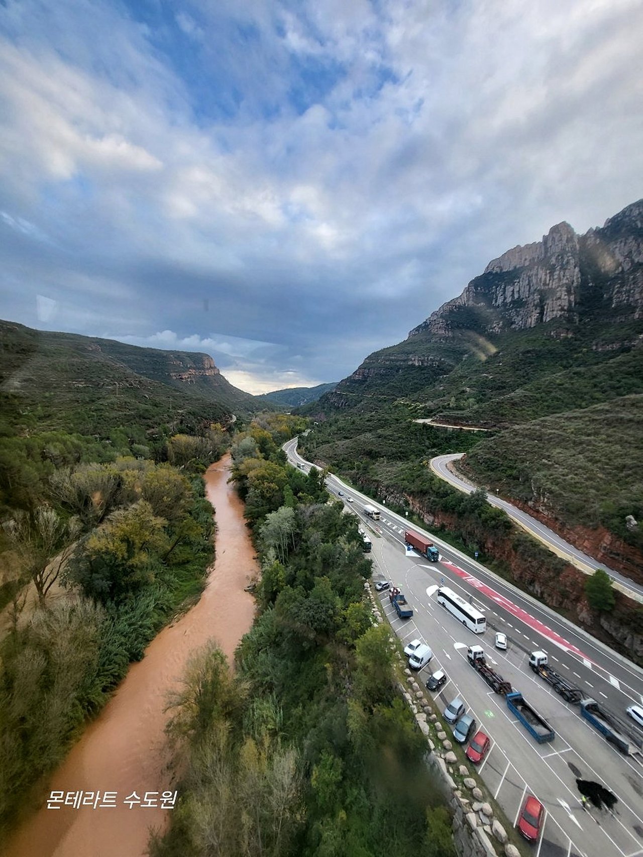 몬세라트 산은 천재 건축가 가우디에게 큰 영감(靈感)을 준 곳이라 한다. 산의 단층지괴는 자연보호 구역으로 험준한 바위풍경을 감상할 수 있는 산책로가 많이 있다. 케이블카를 타고 내려오는데 산 아래 골짜기로 흘러가는 급류(Torrent de Santa Maria)가 대홍수로 인해 온통 진흙탕물로 넘쳐나고 있다.