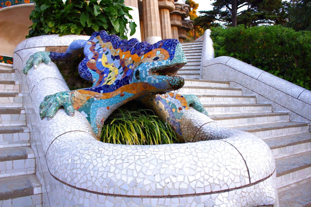 [구엘공원]은 곳곳이 깨진 타일을 모자이크 형태로 붙이는 기법으로 장식된 것이 특징이다. 거친돌로 만든 벽은 빵처럼 부드럽고, 지붕과 창호의 테두리는 크림처럼 녹아내린다. 앙증맞은 발코니와 얼룩 문양의 탑도 동화적 표현이다.