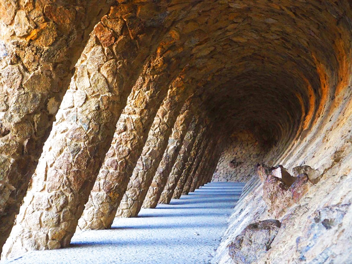 구엘공원 상부지반을 지탱하는 기둥의 묶음인 ➂포르티코(portico)는 파도동굴 또는 미로터널이라 불려진다. 울불퉁한 야자수를 닮은 돌기둥과 곡선을 이용한 디자인이 많아, 돌인 듯 나무 같고, 야자수 나무인 듯 돌 같은 예술적 경계를 파괴한 가우디의 혁신적인 건축 작품이 환상적인 느낌을 준다.