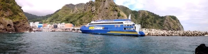 울릉도에서 숙소는 도동이나 저동을 이용하면 편의시설이 잘 갖춰져 있지만 금차 하나투어는 사동에 숙소를 정했다. 잠실 롯데마트를 7시 출발해 묵호에 10시 도착, 동해 대진항에서 식사를 마친 후 썬플라워호에 올라 물살을 가르며 16시 도동항에 이른다. 썬플라워는 985명의 여객과 152대의 승용차 선적이 가능한 대형 여객선이다.