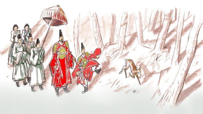 illustrator / 장선환그 사슴은 성종이 몹시 아끼던 궁중 애완동물 이었다. 하지만 융은 사슴이 자신의 옷을 더럽힌 것에 격분한 나머지 부왕이 보는 앞에서 사슴을 발길로 걷어찼다. 이 광경을 지켜보던 성종은 몹시 화가 나서 융을 크게 꾸짖었다. 후일 성종이 승하하자 왕으로 등극한 연산군은 가장 먼저 그 사슴을 활로 쏘아 죽여 버렸다고 전해지고 있다.
