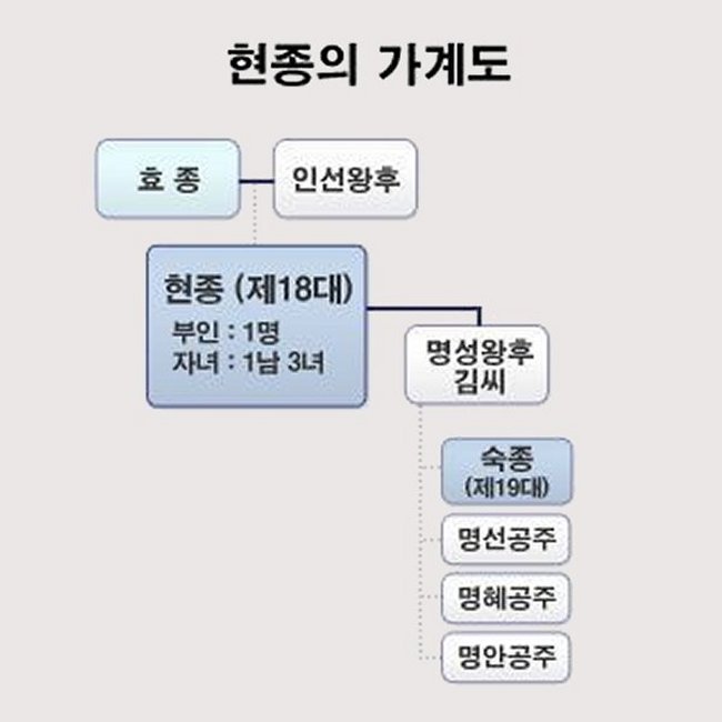 당파적 입장이 매우 강했던 명성왕후는 숙종의 총애를 받았던 [남인세력]의 여인인 장옥정(장희빈)을 그녀의 집안이 남인과 가까웠다는 이유로 궐 밖으로 내치면서 [남인세력]과는 견원지간(犬猿之間)이 되었다. 현종은 선왕 대에 흔들렸던 조선의 지배질서 확립을 위해 노력했다.